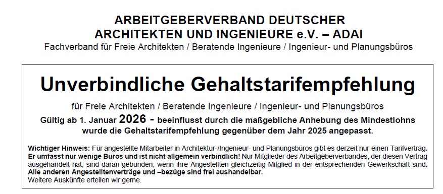 ARBEITGEBERVERBAND DEUTSCHER ARCHITEKTEN UND INGENIEURE e.V. - ADAI veröffentlichen wir die seit Jahren herausgegebenen Gehaltstarifempfehlungen.