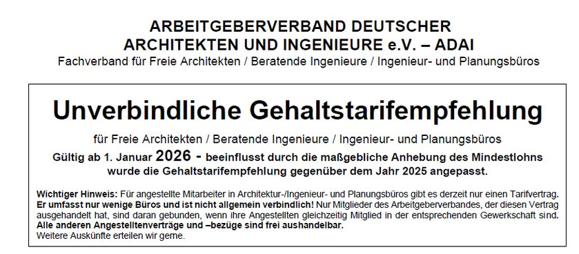 ARBEITGEBERVERBAND DEUTSCHER ARCHITEKTEN UND INGENIEURE e.V. - ADAI veröffentlichen wir die seit Jahren herausgegebenen unverbindlichen Gehaltstarifempfehlungen.